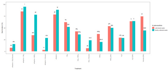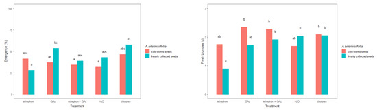 The freshly collected and cold-stored seeds responded differently to the applied treatments, consistent with a treatment–seed interaction (Table 2). In general, the freshly collected A. artemisiifolia seeds emerged in greater numbers than the cold-stored seeds in most cases (Figure 6). However, a significant difference was observed only in the freshly collected seeds that were treated with ethephon + GA3 and thiourea. Moreover, only these two treatments resulted in emergence that was greater than 50%: 53.7% for ethephon + GA3 and 57.8% for thiourea.