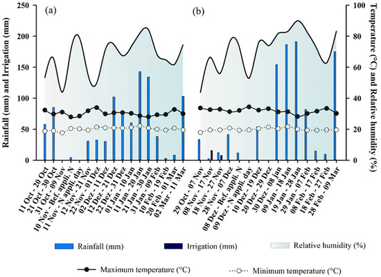 The experiments were conducted in two locations belonging to the Technology Diffusion Unit (UDT) of Cocamar Cooperativa Agroindustrial: one located in the municipality of Floresta (23°35′37″ S; 52°04′06″ W), and another in the municipality of Guairaçá (22°56′48″ S; 52°43′22″ W), at 392 and 478 m above sea level, respectively. The climate of the study area is classified as subtropical humid mesothermal (Cfa) according to the Köppen-Geiger classification system [32]. The rainfall, temperature, relative air humidity, and irrigation depth data during the experiments are shown in Figure 1.