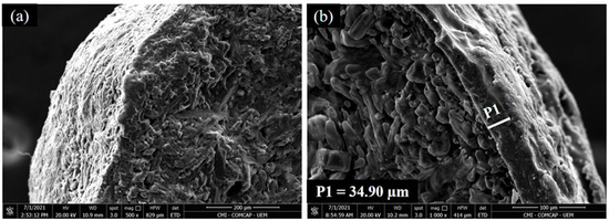 The electron micrographs revealed the transverse morphology of the granules that compose the PCU + Ur-NBPT + NI granule mixture, indicating the presence or absence of coating (Figure 2). Thus, the Ur-NBPT + NI granules do not have a coating layer (Figure 2a), whereas the PCU granules have a polymer coating layer with an average thickness of 34.90 μm (Figure 2b).