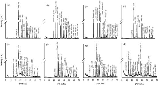 X-ray diffraction of the urea (Ur) (a), ammonium sulfate (b), ammonium nitrate + calcium sulfate (c), Ur-NBPT + Duromide (d), Ur-formaldehyde (e), PCU + Ur-NBPT + NI (f), elemental sulfur (g) and ulexite (h) for conventional and enhanced efficiency nitrogen fertilizers characterization.