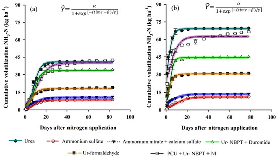 For the NH3-N volatilization data, model selection was performed according to the Akaike information criterion (AIC) [42], and the model with the lowest AIC was chosen. After selecting the model, the data were subjected to nonlinear regression using SigmaPlot software, using the logistic model of three parameters (α, β and γ) represented by Equation (1), as described by Seber and Wild [43]. This model has traditionally been used to estimate plant growth and nutrient uptake rates [44] and has been more recently used to estimate losses by NH3-N volatilization [9,13].