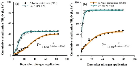 Cumulative volatilization of NH3-N after topdressing applications of the separate granules PCU and Ur-NBPT + NI for clayey soil at a rate of 200 kg ha−1 of N (a) and for sand soil at a rate of 150 kg ha−1 of N (b). Data with overlapping vertical bars with 95% confidence interval in the curve.