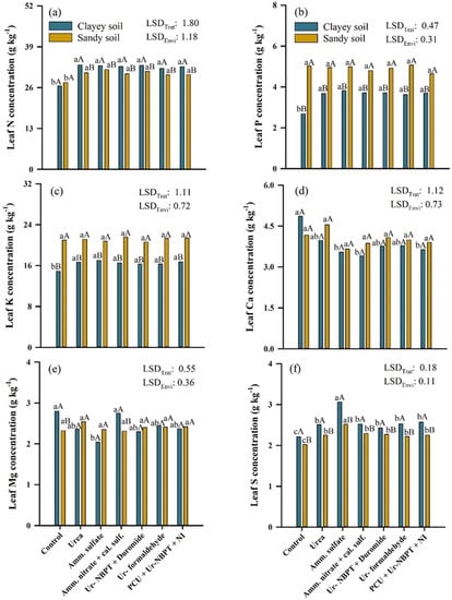 Concentration of nitrogen (a), phosphorus (b), potassium (c), calcium (d), magnesium (e), and sulfur (f) in the corn leaf after fertilization in topdressing with nitrogen sources urea, ammonium sulfate, ammonium nitrate + calcium sulfate, Ur-NBPT + Duromide, Ur-formaldehyde, and PCU + Ur-NBPT + NI for clayey and sand soil. Treatments followed by the same lowercase letter do not differ using a Tukey test (p < 0.05). Environments followed by the same capital letter do not differ using a Tukey test (p < 0.05). LSDTrat: least significant difference for treatments. LSDEnvi: least significant difference for environment.