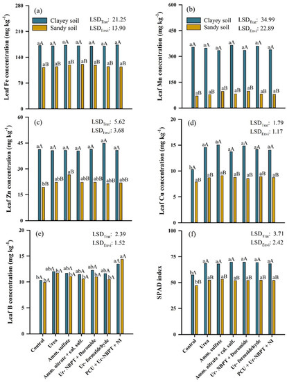 Concentration of iron (a), copper (b), zinc (c), manganese (d), boron (e), and SPAD index (f) in the corn leaf after fertilization in topdressing with nitrogen sources urea, ammonium sulfate, ammonium nitrate + calcium sulfate, Ur-NBPT + Duromide, Ur-formaldehyde, and PCU + Ur-NBPT + NI for clayey and sand soil. Treatments followed by the same lowercase letter do not differ using a Tukey test (p < 0.05). Environments followed by the same capital letter do not differ using a Tukey test (p < 0.05). LSDTrat: least significant difference for treatments. LSDEnvi: least significant difference for environment.