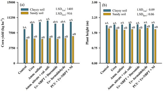 Corn yield (a) and plant height (b) after fertilization in topdressing with nitrogen sources urea, ammonium sulfate, ammonium nitrate + calcium sulfate, Ur-NBPT + Duromide, Ur-formaldehyde, and PCU + Ur-NBPT + NI for clayey and sand soil. Treatments followed by the same lowercase letter do not differ using a Tukey test (p < 0.05). Environments followed by the same capital letter do not differ using a Tukey test (p < 0.05). LSDTrat: least significant difference for treatments. LSDEnvi: least significant difference for environment.