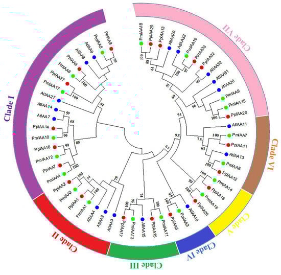 Phylogenetic analysis of PmIAA genes among different family members of Japanese apricot, peach, and Arabidopsis shown in green, red, and blue color dots, respectively. The number on the branches are the bootstrap values and are presented on each node. The outside circle of the phylogenetic tree shows different clades of the tree.