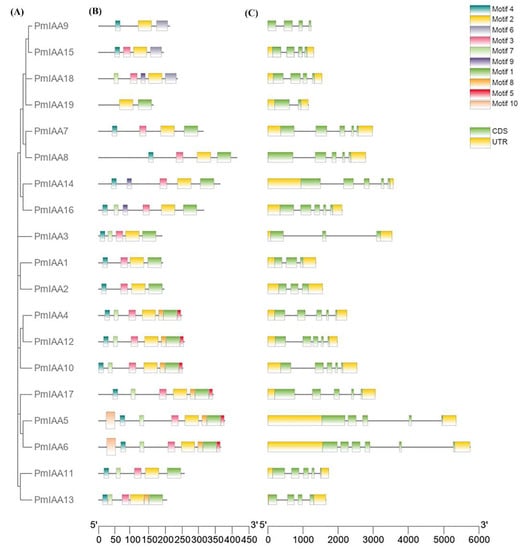 Analysis of phylogeny, gene structure and conserved motif of PmIAAs (A) The phylogenetic relationship of PmIAAs was constructed using MEGA 7.0 (B) conserved motif distribution of PmIAAs. Ten conserved motifs were labeled with different colors using MEME program (C) gene structural organization (CDS, UTR) of PmIAAs. The relative position is uniformly shown based on the Kilobase scale at the bottom of the figures.