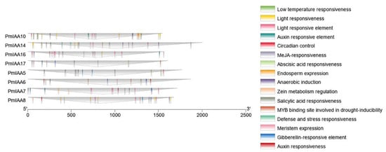 To further investigate the possible function of the PmIAA genes, >1500 kb sequences upstream from the translation initiation site of each PmIAA gene were selected and subjected to the PlantCARE database to identify putative cis-elements. The promoter region of the PmIAA genes contained 16 different types of cis-elements, including hormone-responsive elements, and development-response associated elements (Figure 3). The light-response and hormone-responsive elements were the most prevalent elements among all PmIAA genes. Furthermore, several additional stress response elements such as low temperature, anaerobic induction, and defense and stress responsiveness elements, and so on were also discovered, suggesting that they play an imperative role in coping with a variety of stresses. Auxin, Abscisic acid (ABA) and gibberellin-response elements were the most abundant hormone response elements, demonstrating their importance in hormone regulation.