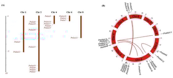 Chromosomal position and gene duplication analysis (A) The chromosomal position of each PmIAA gene was mapped according to the Japanese apricot genome (B) syntenic analysis for gene duplication showed pairs among different chromosomes The gene IDs on the chromosomes indicate the positions of centromeres and the scale on the circle is in Megabases.