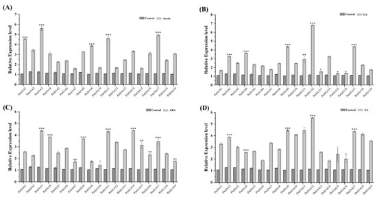 Expression of PmIAA genes in response to (A) auxin (B) GA (C) ABA (D) SA treatments was analyzed through qRT-PCR. The expression levels of PmIAA genes in control seedlings were set to a value of 1. The error bar represents the standard error of their biological repeats. Significant differences between control and treated samples are indicated in an asterisk (*). The sign * represents p ≤ 0.05, ** represents p ≤ 0.01 and *** represent p ≤ 0.001.