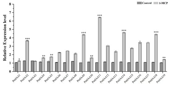The expression of PmIAA genes in response to 1-MCP treatment was analyzed through qRT-PCR. The expression levels of PmIAA genes in control seedlings were set to a value of 1. The error bar represents the standard error of their biological repeats. Significant differences between control and treated samples are indicated in asterisk (*). The sign * represents p ≤ 0.05, ** represents p ≤ 0.01 and *** represents p ≤0.001.