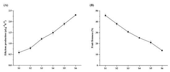 In the process of fruit ripening, ethylene production gradually increases from S4 to onward stages (Figure 7A). In the case of fruit firmness, the flesh firmness of the fruit gradually decreased during fruit development and ripening (Figure 7B). Overall, we can see that ethylene production becomes more with fruit ripening and the flesh of the fruit become softened gradually.