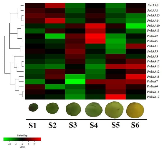 Expression profiles (hierarchical clustering) of PmIAA genes during different stages of fruit development and ripening. Color key shows the expression as red (up-regulated) and green (down-regulated) of the genes. Stages (S1–S6) and the fruit sample are shown under the Heatmap.