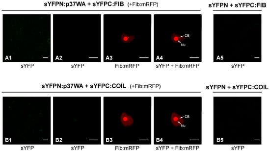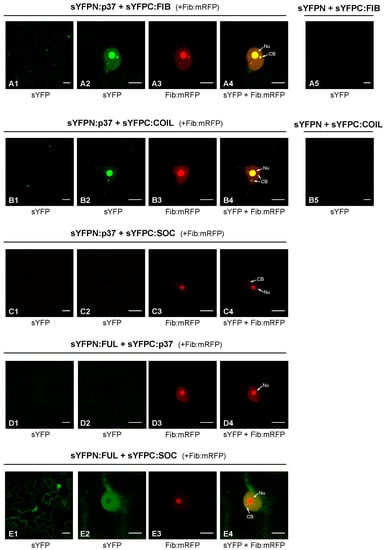 Coilin (COIL) was also employed in BiFC assays with p37 given its reported modulation effects in some plant–virus interactions [11]. Constructs allowing expression of sYFPN:COIL and sYFPC:COIL were engineered and used in proper combinations with constructs sYFPN:p37 and sYFPC:p37 to agroinfiltrate plants. Confocal microscopy observations revealed clear fluorescence in leaf cells co-expressing sYFPN:p37 and sYFPC:COIL (Figure 1B1–B4) or vice versa (sYFPC:p37 and sYFPN:COIL; data not shown), substantiating the establishment of p37–coilin interactions. As observed with fibrillarin, such interactions were detected in the nucleus with strong signals in the nucleolus and CBs. Control experiments in which the distinct fusion proteins were co-expressed with unfused sYFP halves did not yield any fluorescent signal (Figure 1A5,B5), validating the detected interactions. These interactions were further validated by the employment of additional control BiFC constructs directing expression of the two transcription factors, FUL and SOC, which did not give rise to any fluorescent signal in combination with the p37 construct (Figure 1C1–C4,D1–D4). In contrast, the interaction between FUL and SOC was evident (Figure 1E1–E4), in agreement with previous results [20].