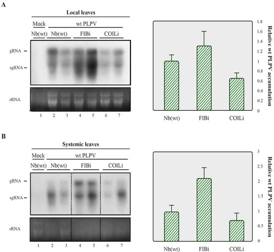 The results obtained in the previous section prompted us to explore whether the newly identified interacting partners of p37 may have an influence on PLPV infection. For this purpose, N. benthamiana lines in which the expression levels of fibrillarin and coilin genes were separately downregulated through RNAi approaches (hereafter, FIBi and COILi lines, respectively) [10,11] were challenged with the wt virus. Non-modified (wt) N. benthamiana plants were also inoculated with wt PLPV for comparison. Harvesting of inoculated leaves at 7 days post-inoculation (dpi) and analysis of the accumulation levels of PLPV through Northern blot hybridization showed a slight augmentation of viral titres in FIBi plants (Figure 2A, left), though further assessment through reverse transcription-quantitative PCR (RT-qPCR) did not support significant differences among the distinct plant genotypes (Figure 2A, right).