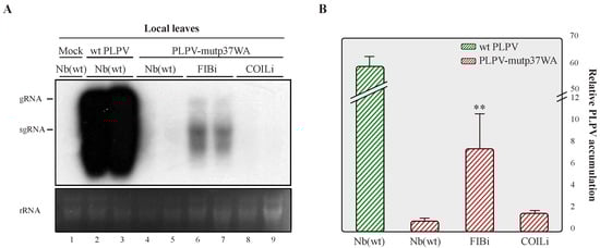 Accumulation of PLPV-mutp37GA in lines of N. benthamiana with downregulated fibrillarin or coilin content. The PLPV-mutp37WA was inoculated in wt, FIBi, and COILi N. benthamiana lines. Northern blot (A) and RT-qPCR (B) analyses of local leaves collected at 7 dpi. For Northern blot (A), a PLPV- specific riboprobe was employed. Positions of the PLPV genomic (g) and subgenomic (sg) RNAs are indicated at the left of the blot, and ethidium bromide staining of rRNAs is included below the blot as loading control. Two distinct samples are shown for each virus–plant line combination. A mock-inoculated plant was included as negative control. In (B), the bars depict the standard deviation from three independent biological replicates. The statistical significance was checked using a paired t-test (** p < 0.01).