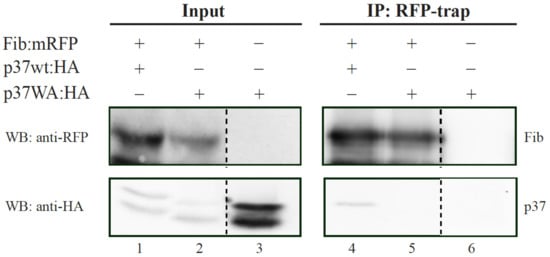 Analysis of fibrillarin interaction with wt p37 and mutant p37WA through a co-immunoprecipitation assay. FIB:mRFP was co-expressed with HA-tagged wt p37 or p37WA in N. benthamiana leaves. N. bentamiana leaves expressing only HA-tagged p37WA were included as control. Input protein extracts or immunoprecipitates (IP) obtained with the employment of ChromoTek RFP-Trap agarose were subjected to Western blot (WB) analysis using either an anti-RFP antibody (for detection of fibrillarin; upper blot) or anti-HA antibody (for detection of p37 molecule; lower blot).