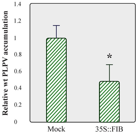 Taking into consideration the positive impact that fibrillarin knockdown had on PLPV accumulation, particularly noticeable with the VSR-defective virus (Figure 4), we examined whether overexpression of this nucleolar protein could lead to the opposite outcome, i.e., a reduction in viral accumulation. We tested this possibility with the wt PLPV since the titres of the PLPV-mutp37WA were virtually imperceptible in wt N. benthamiana plants (Figure 4, lanes 4–5). To approach this issue, FIB:mRFP was transiently expressed in wt N. benthamiana leaves through agroinfiltration and, at 3 dpif, the leaves were challenged with wt PLPV. Three days later, a significant reduction in virus accumulation levels was detected in FIB:mRFP overexpressing leaves in comparison with the mock controls (Figure 6). The results further supported the involvement of fibrillarin in an anti-PLPV response.