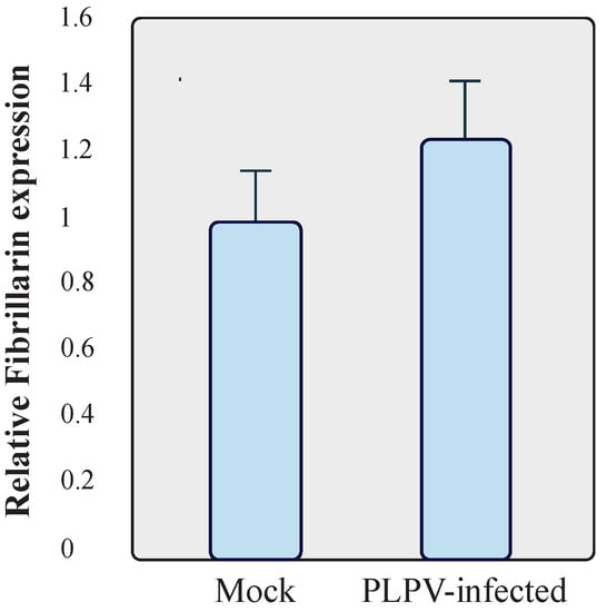 Assessment of mRNA fibrillarin levels. Total RNA preparations were obtained from mock and PLPV-infected wt N. benthamiana plants and subjected to RT-qPCR to estimate relative levels of fibrillarin transcripts. The bars depict the standard deviation from three independent biological replicates. The statistical significance was evaluated using a paired t-test (no significant differences were detected).