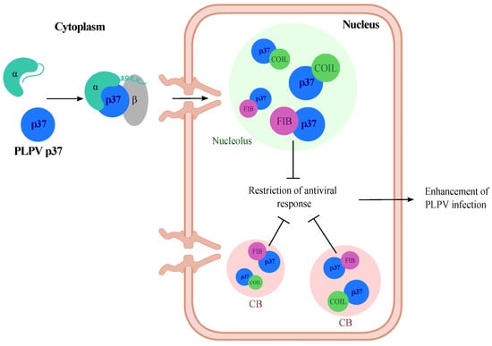 Proposed model reflecting the involvement of fibrillarin in an antiviral pathway targeted by PLPV p37. Protein p37 enters the nucleus assisted by an importin (α, β)-mediated pathway (Pérez-Cañamás and Hernández, 2018) and reaches high accumulation at nucleolus and Cajal bodies (CB). In these subnuclear structures, p37 interacts with the signature proteins, coilin and fibrillarin. The latter interaction interferes with a fibrillarin-linked antiviral pathway, thus favouring PLPV infection.