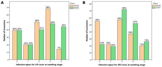 Summary of infection types among 193 tetraploid wheat cultivars and breeding lines infected with races of (A) Puccinia triticina Eriks. (LR) and (B) Puccinia graminis f. sp. tritici (SR) at the seedling stage.