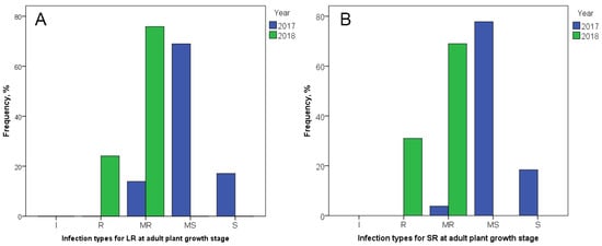 APR to LR and SR, assessed in the field of Karabalyk agricultural experimental station (KAES), varied significantly between two years (Figure 2). In 2017, the largest part of the studied durum collection demonstrated MS infection type in both LR (69%) and SR (77.8%). A small number of accessions showed MR (13.9% to LR and 3.8% to SR) and S (17.1% to LR and 18.4% to SR) infection types, and no I or R reactions were observed. In 2018, in contrast, the majority of the collection presented MR to LR (75.9%) and SR (69%) with a minor R infection type (24.1% to LR and 31% to SR). Infection types MS and S were not registered in 2018. Thus, the studied tetraploid wheat collection was more susceptible to LR and SR in 2017 and more resistant in 2018.