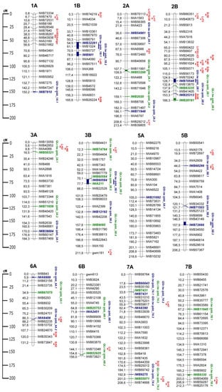 Six QTLs—QLr.tw.ipbb_3A.2, QLr.tw.ipbb_3B.3, QLr.tw.ipbb_3B.4, QLr.tw.ipbb_6A.1, QLr.tw.ipbb_7A.1, QLr.tw.ipbb_7B.1—on chromosomes 3A, 3B, 6A, 7A, and 7B were significantly associated with resistance to LR, but did not overlap with known Lr genes or QTLs of tetraploid and hexaploid wheat and, therefore, can be considered as novel LR resistance loci (Figure 3 and Table 9). Three of them were APR QTLs (QLr.tw.ipbb_3A.2, QLr.tw.ipbb_6A.1, QLr.tw.ipbb_7B.1), detected at the adult plant growth stage (Table 7). The other three (QLr.tw.ipbb_3B.3, QLr.tw.ipbb_3B.4, QLr.tw.ipbb_7A.1) were identified at the seedling growth stage (Table 7).