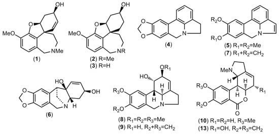 - Bastida, J.; Lavilla, R.; Viladomat, F. Chemical and biological aspects of Narcissus alkaloids. In The Alkaloids: Chemistry and Physiology; Cordell, G.A., Ed.; Elsevier: Amsterdam, The Netherlands, 2006; Volume 63, pp. 87–179. [Google Scholar] [CrossRef]