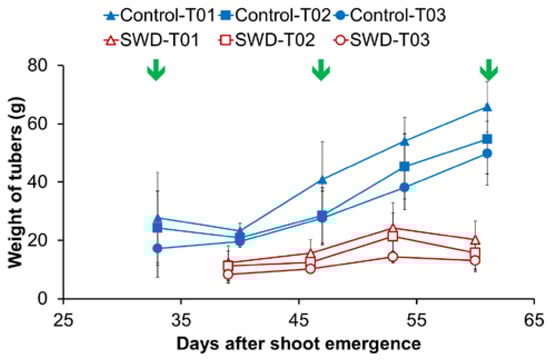 Evolution of tuber weight during the growth period expressed in days after shoot emergence (DASE). For each of the eight plants (4 Control & 4 subjected to severe water deficit SWD), the three heaviest tubers were labeled T01 to T03 in decreasing order of mass at harvest. Weight values correspond to the average of four observations (n = 4) and standard deviation are indicated by the segment bars. Arrows indicate the measurement dates for physiological parameters. In the case of SWD plants, dates correspond, respectively, to 1 to 5 weeks after irrigation was withheld.