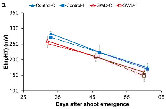 Evolution of (A) pH and (B) redox potential corrected for pH = 7 (Eh (pH7)) in potato tuber tissues (C: Cortex; F: Flesh) during tuber filling expressed in days after shoot emergence for both control and severe water-deficit (SWD) conditions. Values correspond to the average of four observations (n = 4) and standard deviation are indicated by the segment bars. The statistical significance of differences in value for tissues, growth periods and water regimes is reported in Table 1, Table 2 and Table 3, respectively.