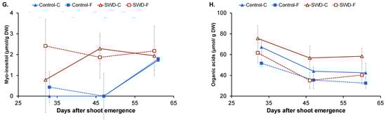 Small amounts of myo-inositol in the potato tuber cortex and flesh were quantified (Figure 3G). For both tissue types in the control tubers, myo-inositol content was negligible. Its content levels increased at the late filling stages reaching values of approximately 2 µmol/g DW. By contrast, equivalent amounts of myo-inositol were already quantified in SWD tubers for both tissue types at 32 DASE and remained stable during the filling period.