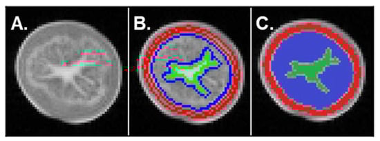 (A) MRI image acquired with a Multi-Spin Echo sequence (echo time = 130 ms, repetition time = 10 s, 0.8 × 0.8 × 5 mm3 voxel) of a potato tuber at 60 days after shoot emergence (DASE). (B) Masks of the three different tissues (cortex, flesh, pith) obtained by means of an automatic segmentation algorithm developed for transverse relaxation time (T2) computation. (C) The three different regions obtained following segmentation according to T2: cortex (red), flesh (blue) and pith (green). See Supplementary Figure S1 for images of the other tubers analyzed at 60 DASE.