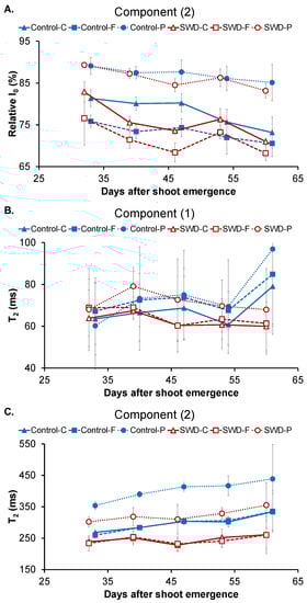 Evolution of (A) component (2) relative signal distribution, (B) component (1) transverse relaxation time (T2) and (C) component (2) T2 in potato tuber tissues (C: Cortex; F: Flesh; P: Pith) during tuber filling expressed in days after shoot emergence for both control and severe water deficit (SWD) conditions. Values correspond to the average of four observations (n = 4) and standard deviation are indicated by the segment bars. The statistical significance of values between tissues, growth periods and water regimes is reported in Table 4, Table 5 and Table 6, respectively.