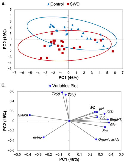 By combining all parameters measured in the cortex and the flesh of tubers on the three different dates (32, 46 and 60 DASE), it was possible to carry out a principal component analysis (PCA) and to propose an exploratory global interpretation of the effects of tissue type, water condition and growth phase. Here, two principal components were significant, explaining 65% of observed variance (Figure 6). The first principal component (PC1) accounted for 46% of the variance and made it possible to distinguish between observations by growth phase (Figure 6A). The most significant variables in this component were the content levels of myo-inositol, starch and other carbohydrates as well as redox potential (Figure 6C). Starch content correlated negatively with glucose, fructose and sucrose along the PC1 axis. Starch content also correlated negatively with component (2) I0, pH, redox potential and WC. Further, the second principal component (PC2) accounted for 19% of observed variance and made it possible to distinguish between observations by water regime (Figure 6B). The most significant variables in this component were the T2 values obtained from MRI measurements (Figure 6C). PCA analysis also showed that the difference between control and SWD conditions increased during tuber filling (Figure 6A,B). However, PCA did not make it possible to distinguish between the cortex and flesh of the potato tubers (Supplementary Figure S3). The content levels for organic acids were almost the only discriminating factor between these two tissues (Figure 3H and Table 1, Table 2 and Table 3).