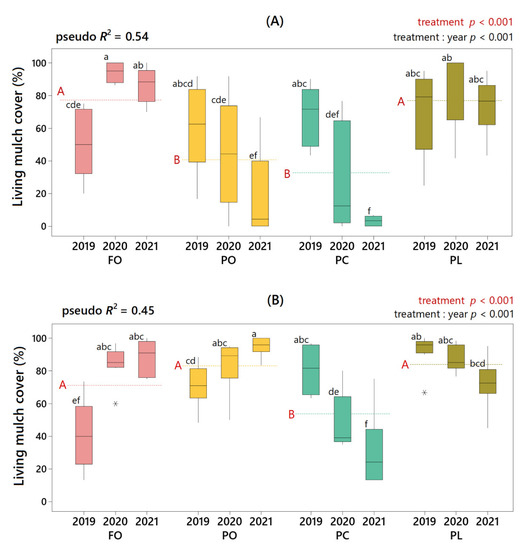 Living mulch cover (%) according to treatment and year on farm A (A) and farm B (B). Dashed lines mark the three-year mean for each treatment (FO, Festuca ovina living mulch; PO, Pilosella officinarum living mulch; PC, Plantago coronopus living mulch; PL, Plantago lanceolata living mulch). Significance levels (p-values) of the factor “treatment” and of the interaction between “treatment” and “year” are indicated in the text in red and black ink, respectively. For the “treatment” level, means were significantly different if red capital letters next to the dashed lines are different. For the “treatment: year” level, boxes with different lower-case black letters had significantly different means. In the upper left corner, pseudo R2 indicates the variance explained by the beta regression model.