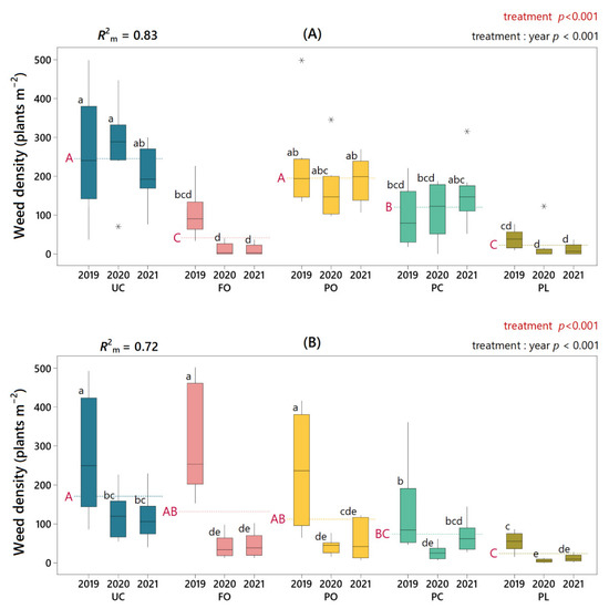 Weed density (plants m−2) according to treatment and year on farm A (A) and farm B (B). Dashed lines mark the three-year mean for each treatment (UC, untreated control; FO, Festuca ovina living mulch; PO, Pilosella officinarum living mulch; PC, Plantago coronopus living mulch; PL, Plantago lanceolata living mulch). Significance levels (p-values) of the factor “treatment” and of the interaction between “treatment” and “year” are indicated text in red and black ink, respectively. For “treatment” level, means were significantly different if red capital letters next to the dashed lines are different. For “treatment: year” level, boxes with different lower-case black letters had significantly different means. In the upper left corner, R2m indicates the variance explained by the fixed effects of the mixed model. Outliers are indicated with an asterisk (*).