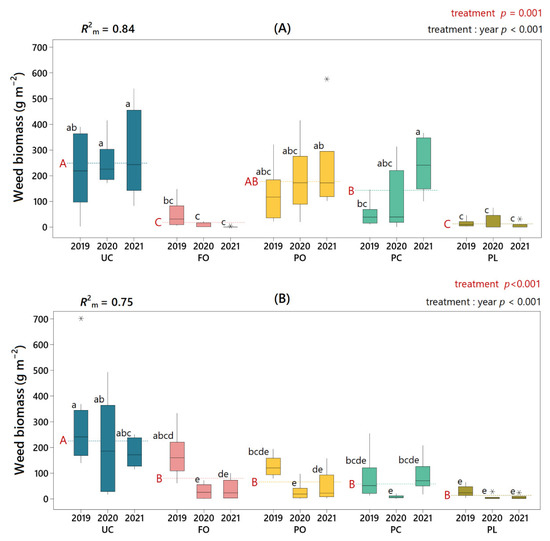 Weed biomass (g m−2) according to treatment and year on farm A (A) and farm B (B). Dashed lines mark the three-year mean for each treatment (UC, untreated control; FO, Festuca ovina living mulch; PO, Pilosella officinarum living mulch; PC, Plantago coronopus living mulch; PL, Plantago lanceolata living mulch). Significance levels (p-values) of the factor “treatment” and of the interaction between “treatment” and “year” are indicated in text in red and black ink, respectively. For the “treatment” level, means were significantly different if red capital letters next to the dashed lines are different. For the “treatment: year” level, boxes with different lower-case black letters had significantly different means. In the upper left corner, R2m indicates the variance explained by the fixed effects of the mixed model. Outliers are indicated with an asterisk (*).