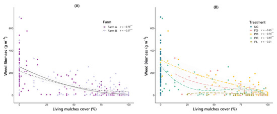 Correlations between living mulch cover (%) and weed biomass (g m−2) considering the factor “farm” (A) and the factor “treatment” (B). Spearman’s correlation coefficient (r) and significance level (no asterisks, non-significant; *** p < 0.001) are indicated for each of the estimated correlations. UC, untreated control; FO, Festuca ovina living mulch; PO, Pilosella officinarum living mulch; PC, Plantago coronopus living mulch; PL, Plantago lanceolata living mulch.
