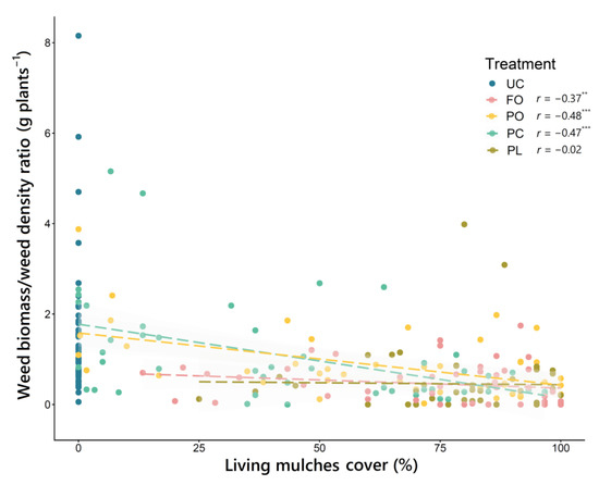 Correlation between living mulch cover (%) and weed biomass/weed density ratio (g plants−1) according to the factor “treatment”. Spearman’s correlation coefficient (r) and significance level (no asterisks, non-significant; ** p < 0.01; *** p < 0.001) are indicated for each of the estimated correlations. UC, untreated control; FO, Festuca ovina living mulch; PO, Pilosella officinarum living mulch; PC, Plantago coronopus living mulch; PL, Plantago lanceolata living mulch.