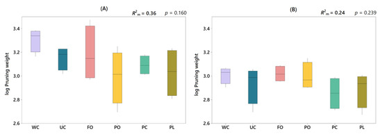 Grapevine vegetative growth (log pruning weight) according to the different treatments applied on farm A (A) and farm B (B): WC, weed-free control; UC, untreated control; FO, Festuca ovina living mulch; PO, Pilosella officinarum living mulch; PC, Plantago coronopus living mulch; PL, Plantago lanceolata living mulch. Marginal R-squared (R2m) indicated in the upper right corner, is the variance explained by the fixed factors of the model, in this case by “treatment”.