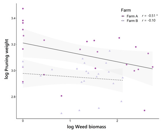 Correlation between weed biomass (log weed biomass) and grapevine vegetative growth (log Pruning weight) according to the factor “farm”. Spearman’s correlation coefficient (r) and significance level (no asterisks, non-significant; * p < 0.05) are indicated for each of the estimated correlations. Confidence intervals (95%) are shown with light-grey shaded areas.