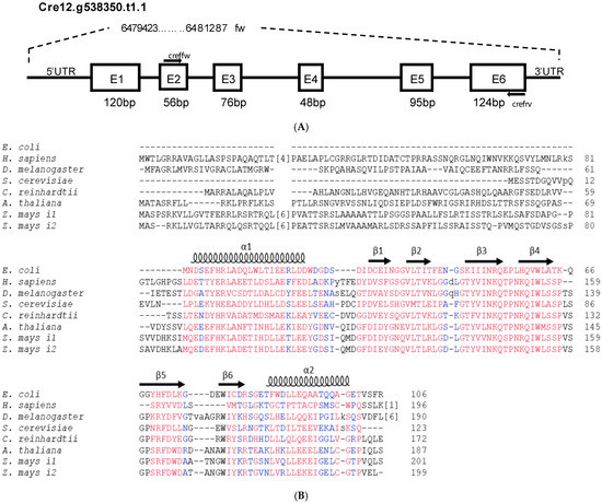 Gene structure organization of Chlamydomonas reinhardtii frataxin. (A) Structure of the gene coding the C. reinhardtii frataxin homologue (Cre12.g538350.t1.1, abbrev. CreFH1). CreFH1 is composed of 6 exons and 5 introns. The arrows correspond to the oligonucleotides used in the molecular analyses. 5’UTR and 3’UTR correspond to the 5’ and 3’ untranslated regions. (B) Alignment of the amino acid sequences of frataxin homologues from different organisms. The protein sequence of CreFH1 (accession number XP_042918788.1) was compared with CyaY from E. coli (accession number NP_418251) and frataxin homologs from H. sapiens (accession number NP_000135.2), D. melanogaster (NP_511094), S. cerevisiae (accession number NP_010163.1), A. thaliana (accession number NP_192233.2) and both Z. mays isoforms (ZmFH1, NP_001150732 and ZmFH2, NP_001146272). Positions with a high degree of conservation are indicated in red, and positions with a lower degree of conservation are indicated in blue. Secondary structure is indicated on the E. coli sequence with coils (α-helices) and arrows (β-sheets). The arrow indicates the position of the transit peptide cleavage predicted with TargetP-2.0 Server [45].
