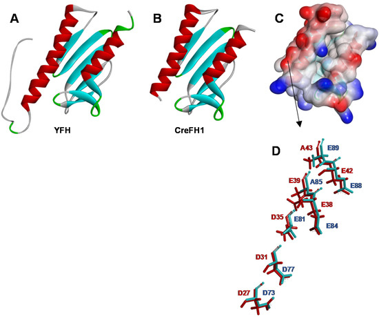 To understand the structure of CreFH1 in more detail, a homology model was built as described in the “Methods” section, using the 3D structure of YFH (PDB entry: 2GA5) as a template. Analysis using ProSA-web server [52] showed a Z-score of −6.34, and the analysis using Verify 3D [53] showed that 95% of the residues had a score >0.2, indicating that the CreFH1 model is of good quality [54,55,56,57]. The monomeric CreFH1 structure exhibited a fold similar to YFH, with both α1- and α2-helix and β1 to β6-sheets conserved (Figure 2A,B). In addition, we found that the conserved N-terminal acidic residues in the α1/β1 regions of CreFH1 generate a negatively charged surface, as reported for other homologs (Figure 2C) [8,47]. These carboxylate side chains of aspartic and glutamic residues could serve as ligands for metal binding, as in many Fe-binding proteins, suggesting that these regions could be involved in this process (Figure 2D) [8]. Moreover, these amino acid residues may also participate in electrostatic interactions that could mediate protein–protein interactions. It was shown that electrostatic interactions play a more important role in protein binding than they do in folding [58,59].