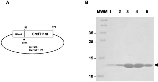 Cloning, expression and purification of CreFH1. (A) Schematic representation of plasmid pCREFH1m used to transform competent E. coli cells to express CreFH1 mature protein (from aa. 53 to 172) with a Hisx6 tag and a TEV protease cleavage site. (B) SDS-PAGE analysis of protein fractions eluted from CreFH1 after digestion with TEV protease. Lane 1: 0.5 ug CreFH1-His; Lane 2: 1 ug CreFH1-His; Lanes 3–5: CreFH1 fractions after digestion with TEV protease.