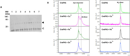 Analysis of CreFH1 oligomerization. (A) Analysis of CreFH1 oligomerization on 8% (w/v) native PAGE. Purified CreFH1 was incubated with metals (33 µM of Fe3+, Cu2+ or Zn2+) for 1 and 3 h, or with water as control. CreFH1 without metals (lane 1); CreF1 incubated with Fe3+ for 1 h (lane 2) or 3 h (lane 3); CreFH1 incubated with Cu2+ for 1 h (lane 4) or 3 h (lane 5); CreFH1 incubated with Zn2+ for 1 h (lane 6) or 3 h (lane 7). Each lane was loaded with 3 μg of protein. The white arrow indicates the CreFH1 monomer, and the black arrow corresponds to the dimer. MM is the native molecular mass marker (GE Healthcare Protein and Peptide Molecular Weight Markers). (B) ESI-MS spectra of CreFH1. Mass spectra were obtained after incubation of recombinant CreFH1 with Cu2+, Fe3+, Zn2+ or water (control, first panel) for 3 h. All the spectra showed the +1 charge state for the Apo-monomeric and M2-dimeric species. Notice that M-dimeric forms were observed at the +2 charge state (around 14,335 m/z), and that this species had a higher peak when CreFH1 was incubated with Cu2+. M denotes a metal.