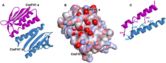 Haddock structure of dimeric CreFH1 with the highest score and lowest energy. (A) Ribbon structure representation of the CreFH1a:CreFH1b dimeric complex. (B) Electrostatic potential surface representation of CreFH1 dimer. Red and blue show negative and positive potentials, respectively. The complex has the same orientation as the ribbon structure shown in Figure 5A. (C) α1-helix segments from both subunits of the CreFH1 dimer showing the amino acid residues that would participate in the interaction.