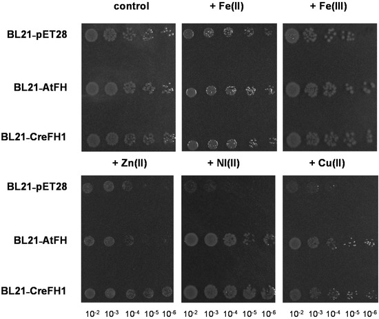 Effect of different metals on E. coli cells overexpressing CreFH1. E. coli cells transformed with the empty vector; AtFH and CreFH1 were spotted in 1/10 serial dilutions on LB agar plates supplemented with kanamycin (control), Fe(NH4)2(SO4)2 2 mM, Fe(III) EDTA 1 mM, Zn2SO4 1 mM, NiCl2 1 mM and CuSO4 1 mM. Cells were incubated overnight at 37 °C.