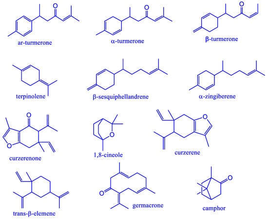 The genus Curcuma (Zingiberaceae) is composed of 93 species that mainly originate from Asia, Australia, and South America, and are now cultivated worldwide. Members of this genus have a long history for their medicinal purposes and nutritional values as well as in cosmetics industries [1,2,3]. The major pharmacologically active constituents of Curcuma species are curcuminoids and essential oils. Curcuminoids, a mixture of three phenolic compounds namely curcumin, demethoxycurcumin, and bis-demethoxycurcumin, have been proven to posses significant health benefits along with the potential to prevent various diseases [4,5,6]. Essential oils of Curcuma species are relatively complex with hundreds of components including terpenes and oxygenated terpenoids. Fragrances and characteristic aromas of Curcuma essential oils are due to either a large number of monocyclic bisabolane derivatives or guaiane type sesquiterpenes or germacranes type sesquiterpenes [7]. Different Curcuma species essential oils were used in food applications (flavoring, coloring, and preservatives) [8], personal goods (cosmetics and perfumes) [9], and to cope and deal with a variety of ailments (inflammatory conditions of various organs, digestive tract problems, neurodegenerative diseases, wound healing, cancer, viral diseases, and diabetes) [10,11,12,13,14].