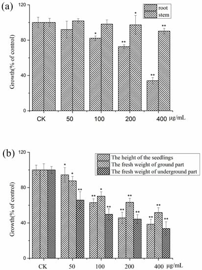 The phytotoxic activity of the crude extract was evaluated with Lactuca sativa L. (Figure 1a) and potato tissue culture (Figure 1b) seedlings. The results revealed that the crude methanol extract significantly inhibited the growth of the treated seedlings and the effect was in a concentration-dependent manner. The crude extract exhibited a more remarkable inhibitory effect on the growth of roots than that on stems for L. sativa seedlings. As Figure 1a showed, the inhibition ratios of roots at the treated concentrations of 100, 200, and 400 μg/mL were 17.82%, 27.39%, and 65.96%, respectively. The growth of potato seedlings was observably inhibited by the crude extract in a similar manner. The inhibitory effect on the growth of the roots was more pronounced than that on the leaves and stems for the potato seedlings, which was in accordance with the growth of L. sativa. As shown in Figure 1b, at a concentration of 100 μg/mL, the inhibition ratios of the height of the potato seedlings, the fresh weight of leave and stems, and the fresh weight of the roots were 37.03%, 29.73%, and 50.17%, respectively. The inhibition ratios at the treated concentration of 200 μg/mL reached up to 54.25%, 36.68%, and 55.63%, respectively. At the maximum concentration (400 μg/mL), the inhibition ratios ran up to 61.26%, 48.20%, and 66.28%, respectively.