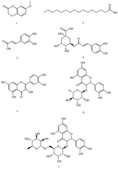 Seven compounds were isolated from the extract of the rhizosphere soil of potato; they were identified as: 7-methoxycoumarin (1), palmitic acid (2), caffeic acid (3), chlorogenic acid (4), quercetin dehydrate (5), quercitrin (6), and rutin (7). Their structures were characterized by spectroscopic analysis in comparison with literature data. The structures of compounds 1–7 are shown in Figure 2.